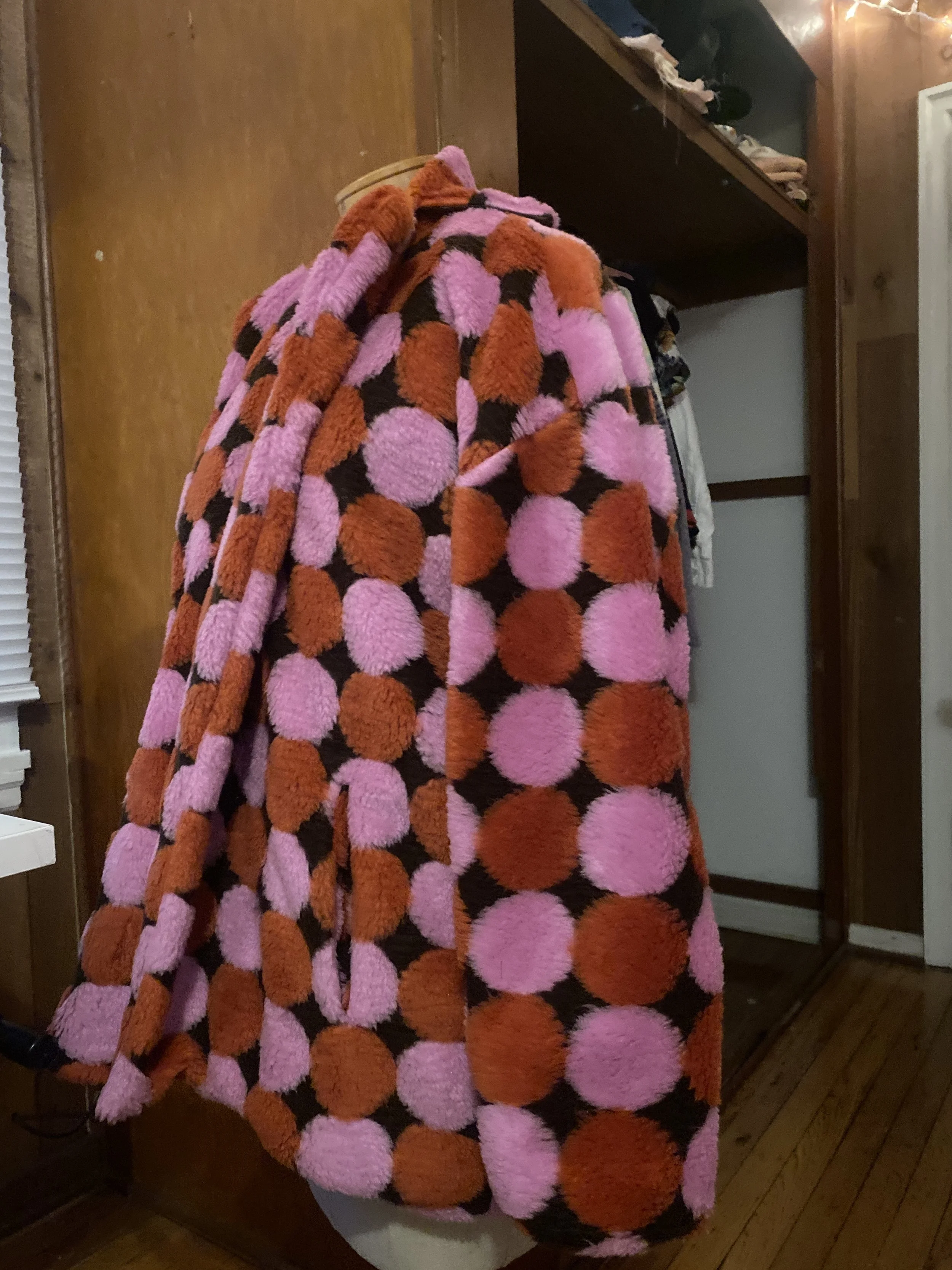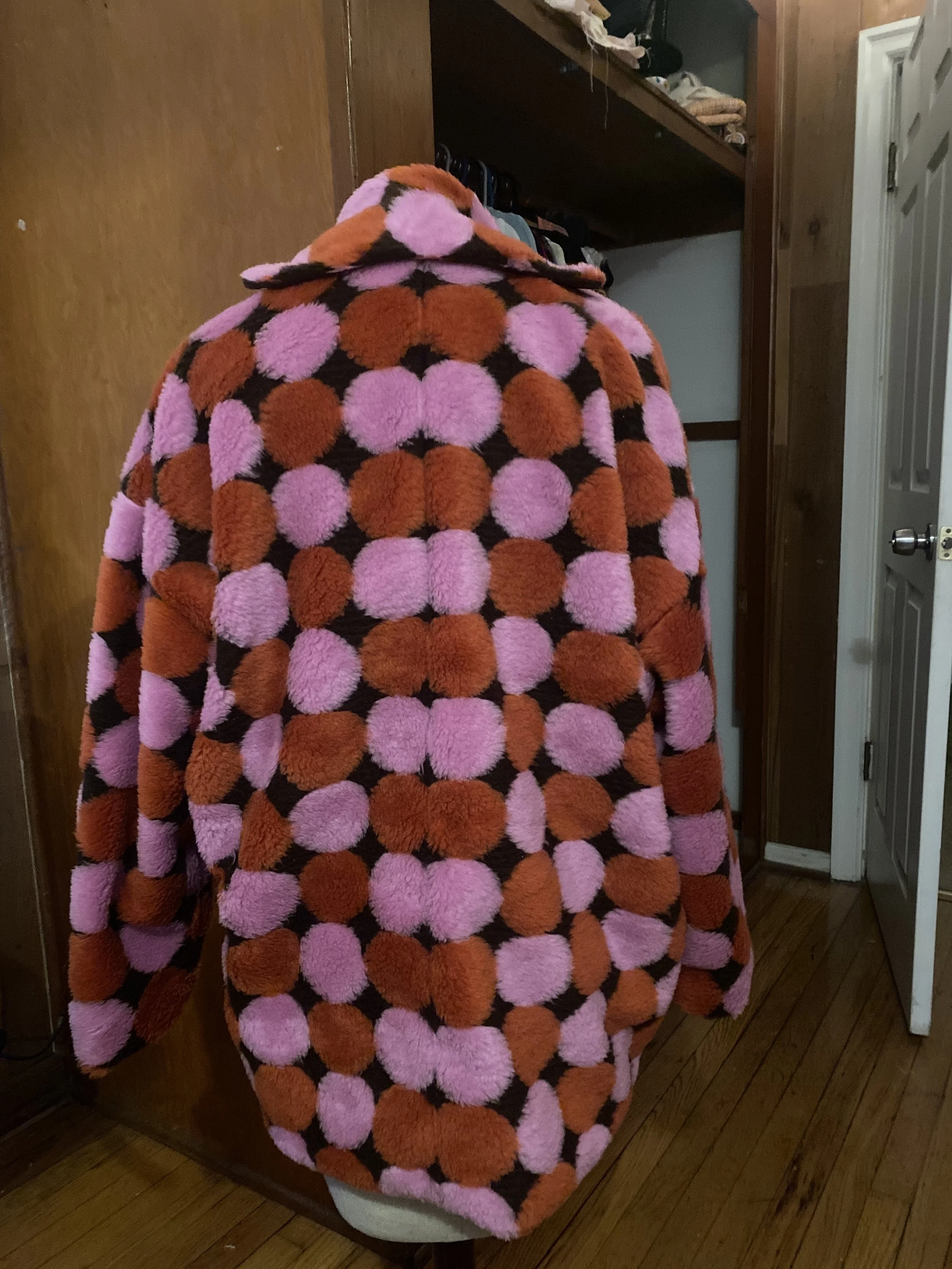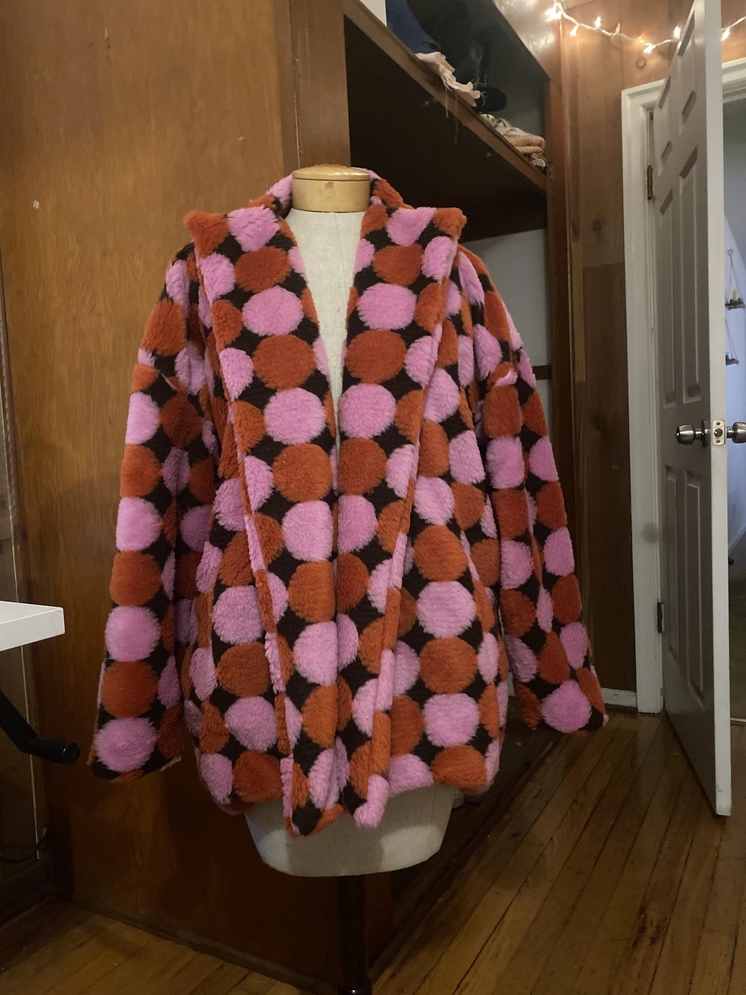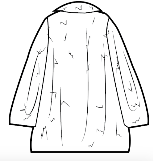 This final look is an oversized faux fur coat. This look came to me when I found the featured deadstock fabric. I immediately fell in love with it and knew it would be the perfect textile to turn into this statement-piece oversized jacket. I created this design with a combination of flat pattern manipulation and the emulation of a pre-existing jacket.